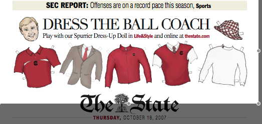 South Carolina football coach Steve Spurrier has not been fashionably forward. We tried to help him out with our Flash game and our print centerpiece in Life&Style. We got more than 25,000 hits in one day. A sports radio show lambasted us for doing it. Tee-hee.