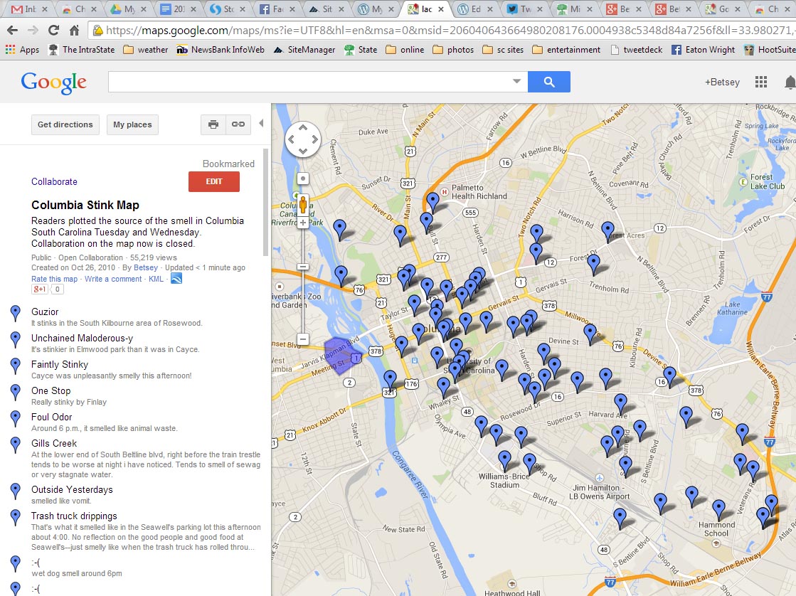It’s one of those “editors” stories — you know, something happens to an editor or her friends. Colleagues walked into the office saying it just stunk outside. When someone said it stunk on the other part of the town, we began investigating. We were getting nowhere in finding the source of the stink. So I created a quick Google map, opened up collaboration, and asked readers to pinpoint the time and place they noticed the odor. It became a fun complement to our coverage, which revealed that a former city councilman’s spread of manure on his farm outside of town was responsible.